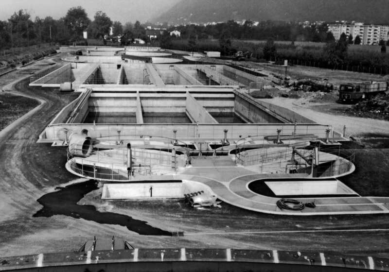 Consorzio depuratori Locarno, impianto di trattamento Foce Maggia (IDAL Foce Maggia). Situazione al 16 settembre 1982: dissabbiatori, bacino di decantazione primaria, bacini d'aerazione, bacini di decantazione secondaria