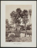 Palme Doum L'immagine mostra un'oasi del tipico palmeto Doum con un gruppo di uomini in posa di fronte allo specchio d'acqua
