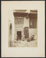 Uomini in un cortile L'immagine mostra un cortile con mura decorate, pannelli in legno intagliati a copertura delle finestre e un tappeto appeso accanto al portone. Si nota una donna velata mentre cerca di nascondersi, e tre uomini.