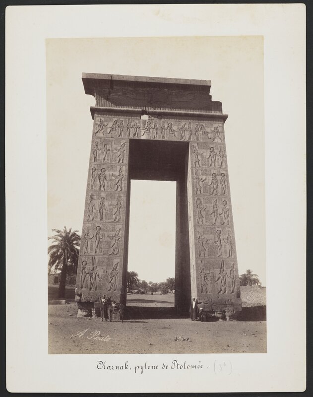Fotografia del pilone di Tolomeo III nel complesso templare di Karnak, visto dall'interno verso Luxor