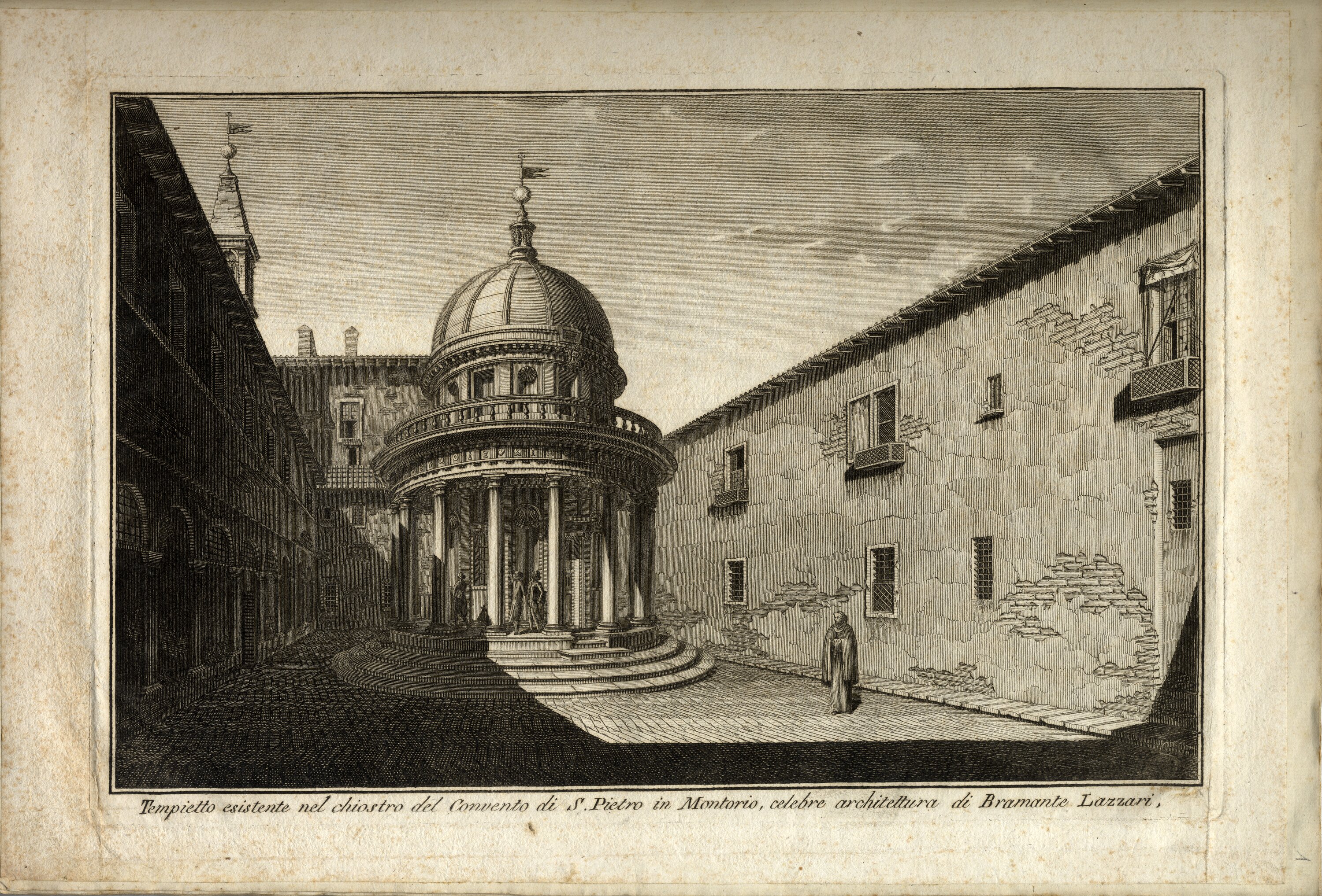 Veduta del Tempietto del Bramante. Opera apparsa in "Delle magnificenze di Roma antica e moderna libro primo [-decimo] dedicate alla sacra real maestà ... da Giuseppe Vasi da Corleone pittore architetto e pastore arcade". In Roma : nella stamperia del Chracas presso S. Marco al Corso, 1747-1761