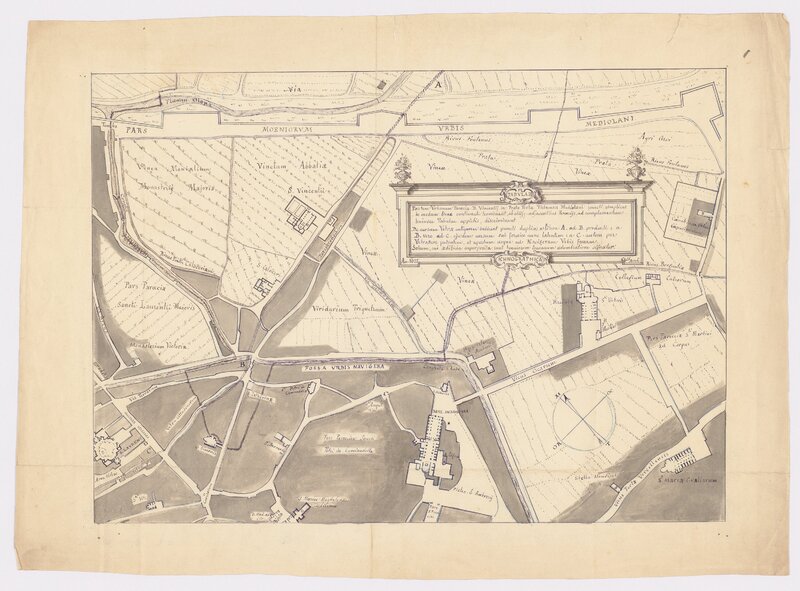 Iconografia di Milano raffigurante l'area della parrocchia di San Vincenzo in Porta Ticinese, con indicazioni a penna dei luoghi rappresentati