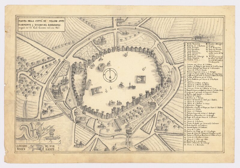 Mappa di Milano prima dell'assedio del Barbarossa del 1162, a volo d'uccello, con didascalia dei luoghi (A-R) e degli edifici (1-43) rappresentati