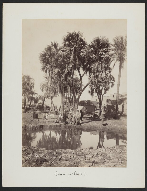 - L'immagine mostra un'oasi del tipico palmeto Doum con un gruppo di uomini in posa di fronte allo specchio d'acqua