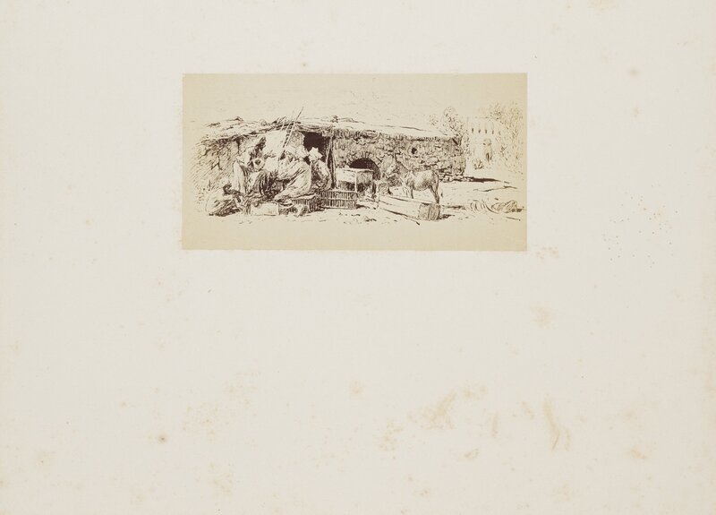 Uomini riuniti fuori da una capanna, disegno