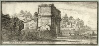 Arco di Costantino in Roma Assonometria dell'arco che occupa tutta la tavola. Due casette poste davanti al monumento