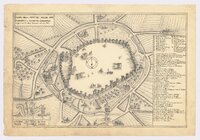 Pianta della città di Milano anteriormente l'eccidio del Barbarossa Mappa di Milano prima dell'assedio del Barbarossa del 1162, a volo d'uccello, con didascalia dei luoghi (A-R) e degli edifici (1-43) rappresentati